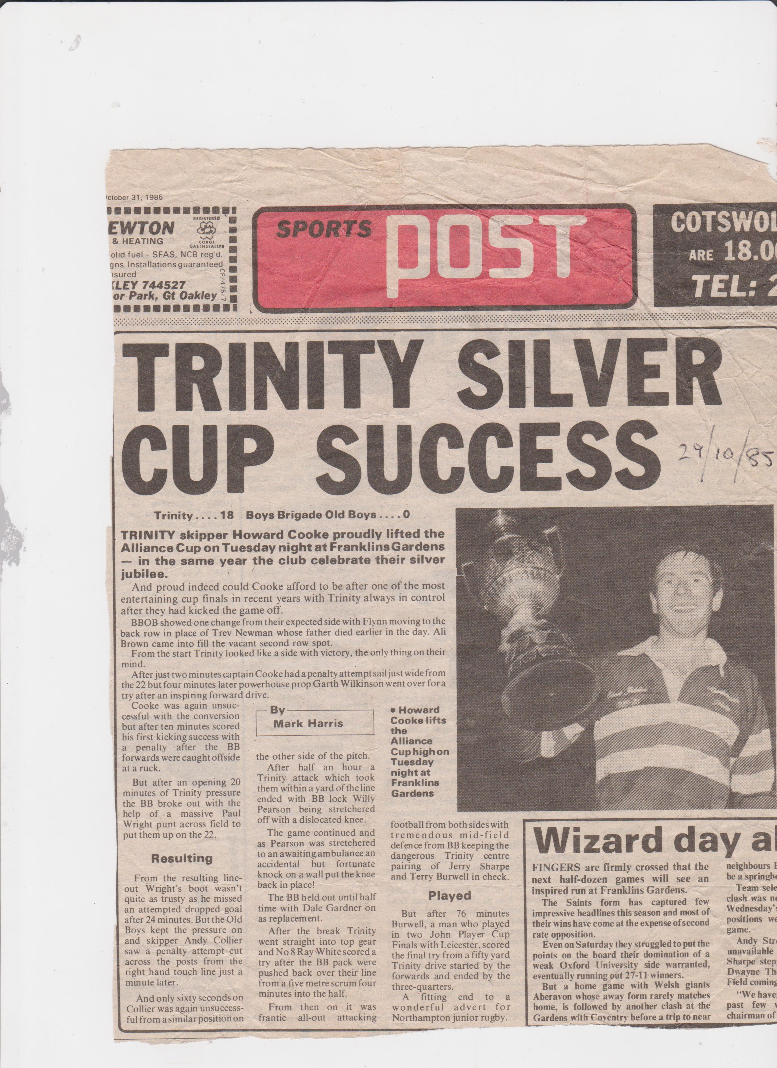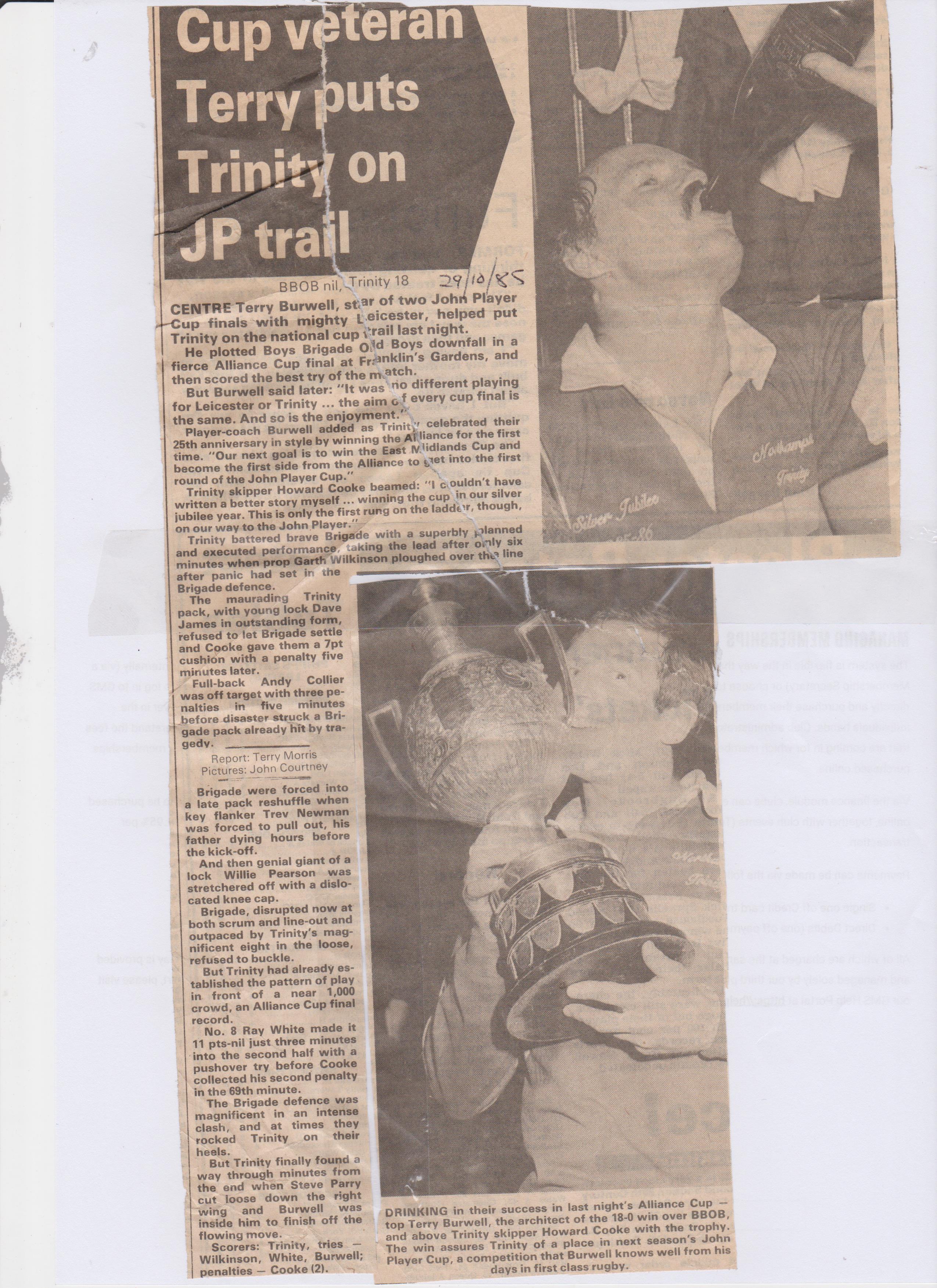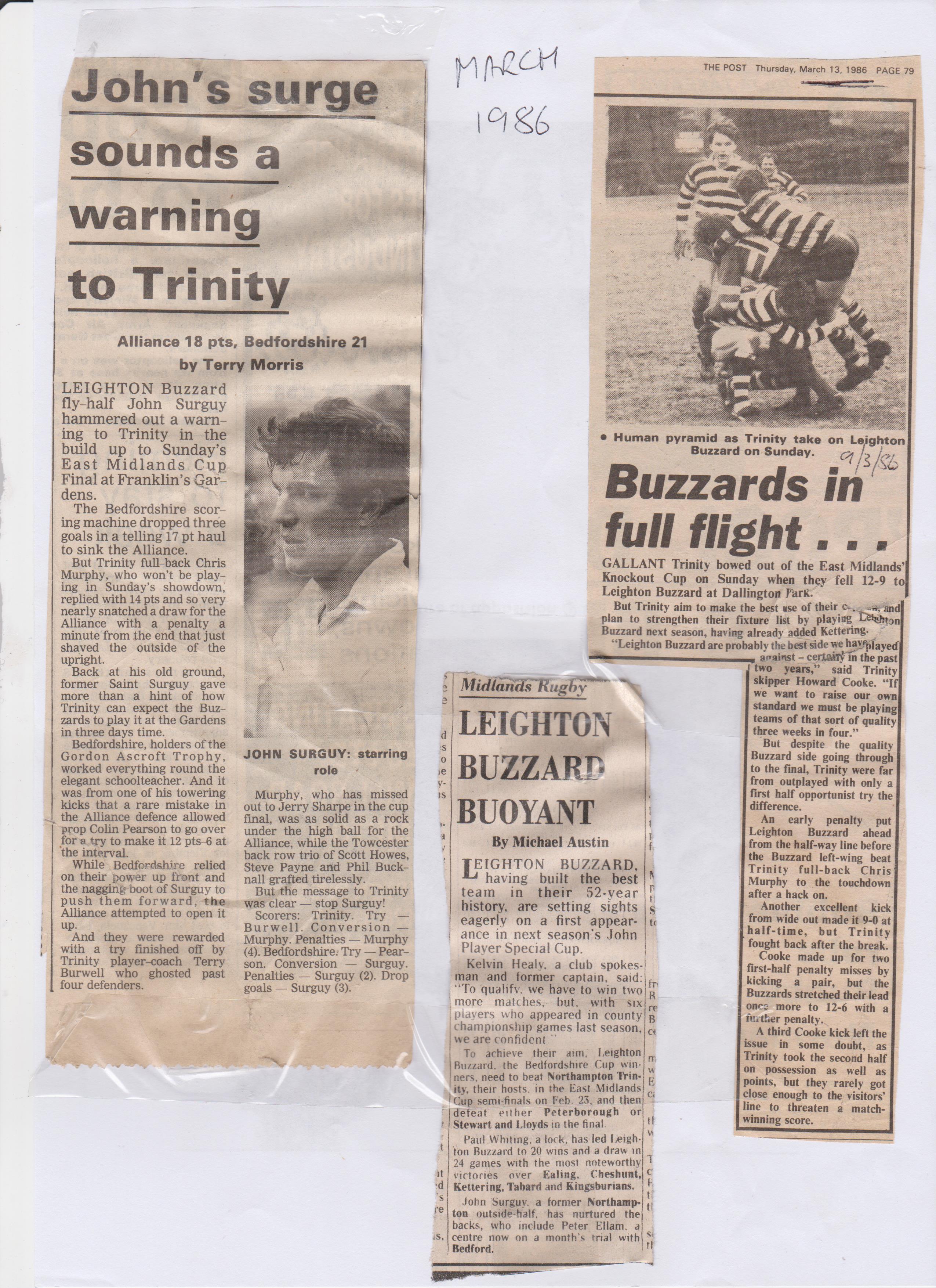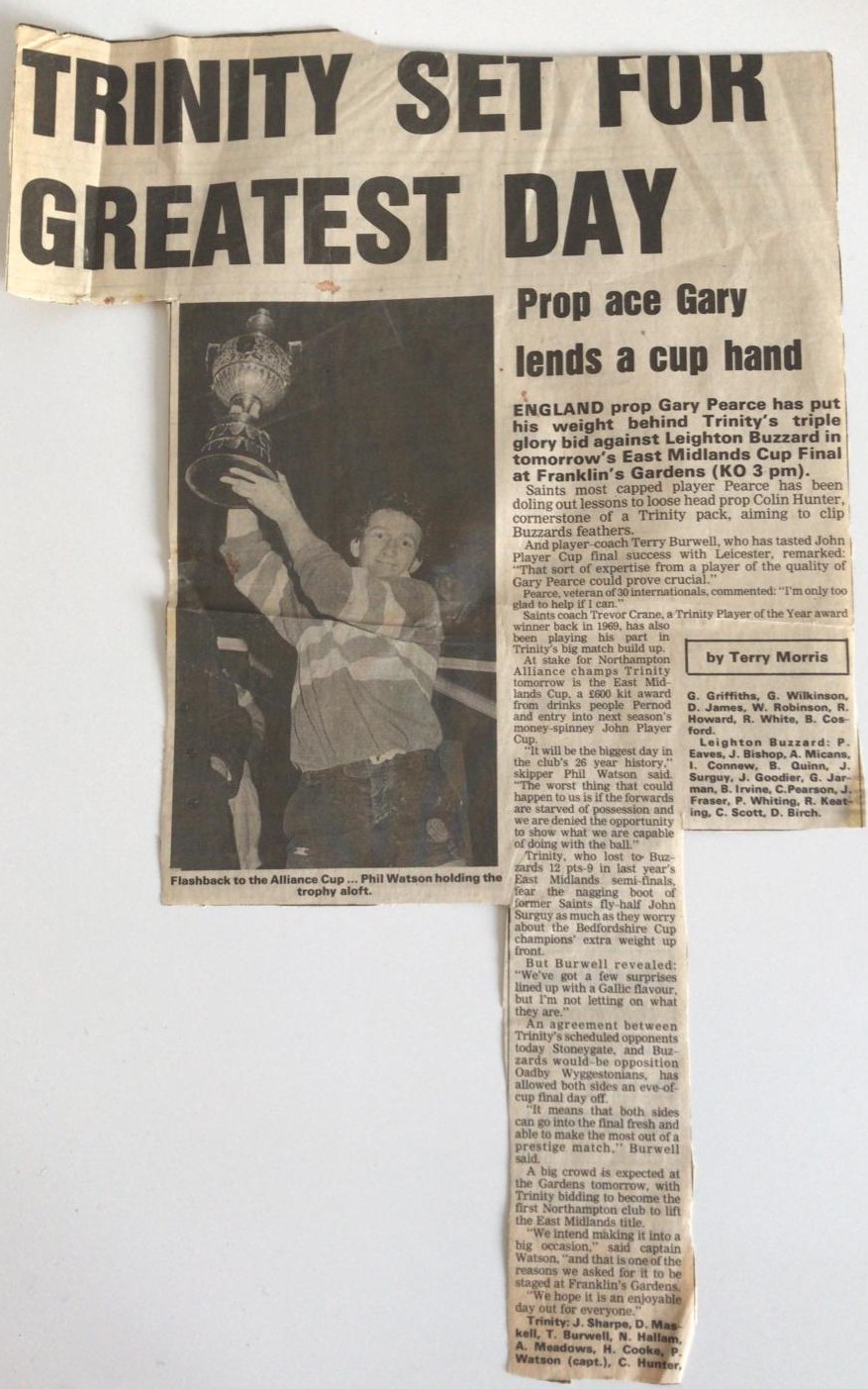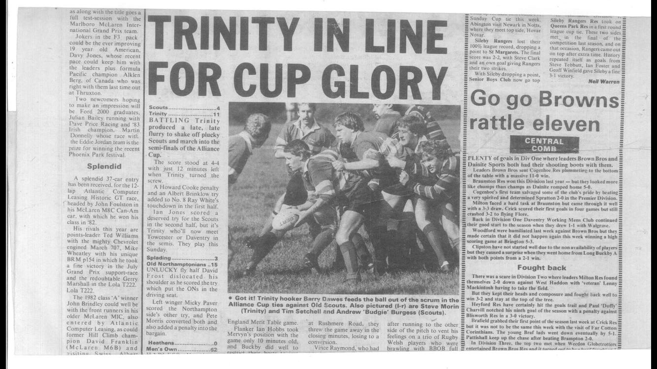 This led to us playing in the East Midlands Cup against the winners and runners up of the other sub counties of EMRU (East Northants, Bedfordshire, Hunts & Peterborough). The eventual winners were then entered into the 1st Round of the then John Player Cup (later Pilkington) where they could meet any of the “Senior” sides – in 1981/2 Kettering RFC lost to Saints 31-0! Unfortunately on both occasions we lost to Leighton Buzzard, in 1985 in the semi final, then losing the final in 1986.