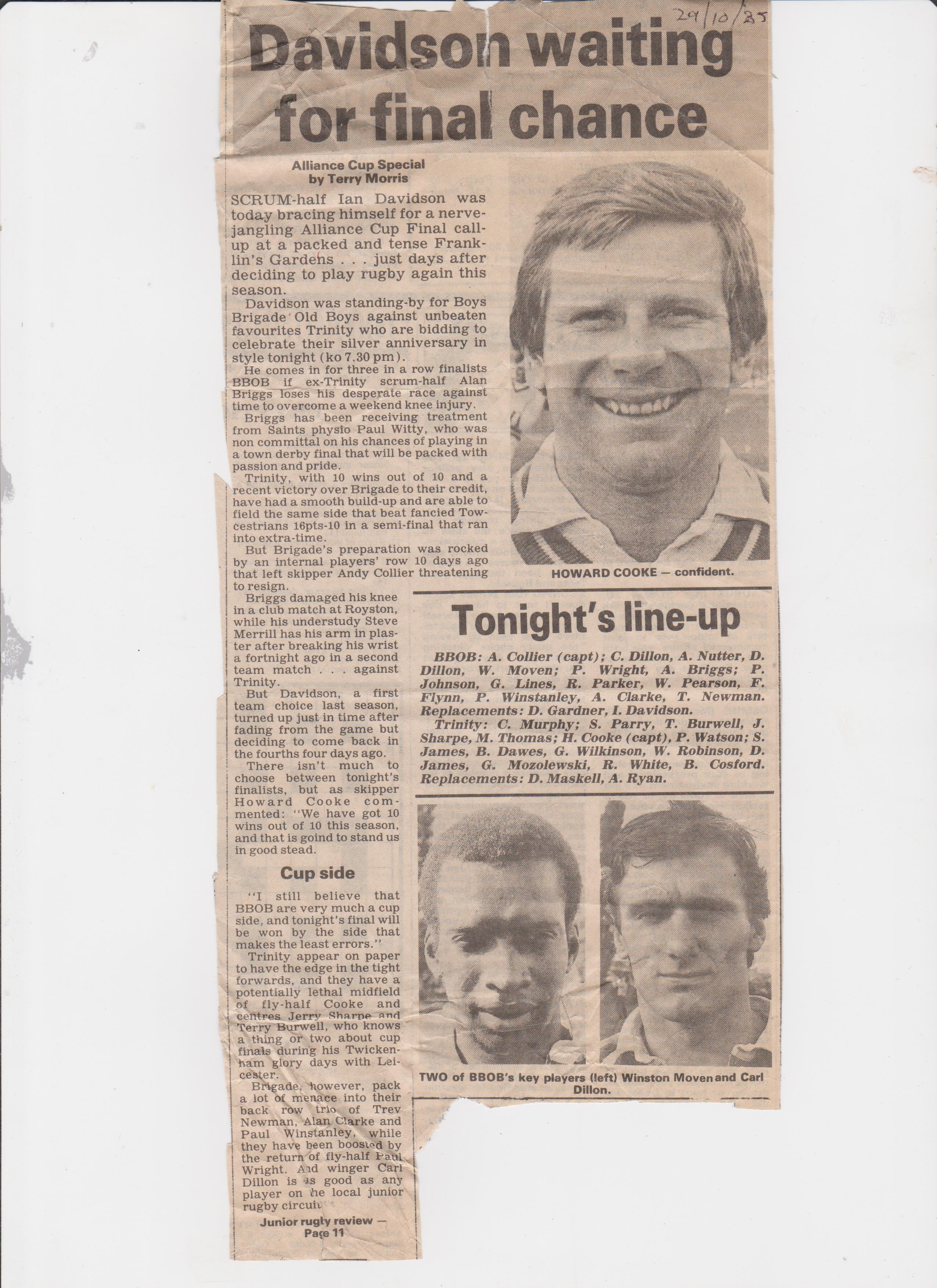 As we have said the club really developed during the 1980s, the culmination was probably from 1985 – 87 when we reached the Alliance Cup Final, winning 2 years in succession 1985 & 86.