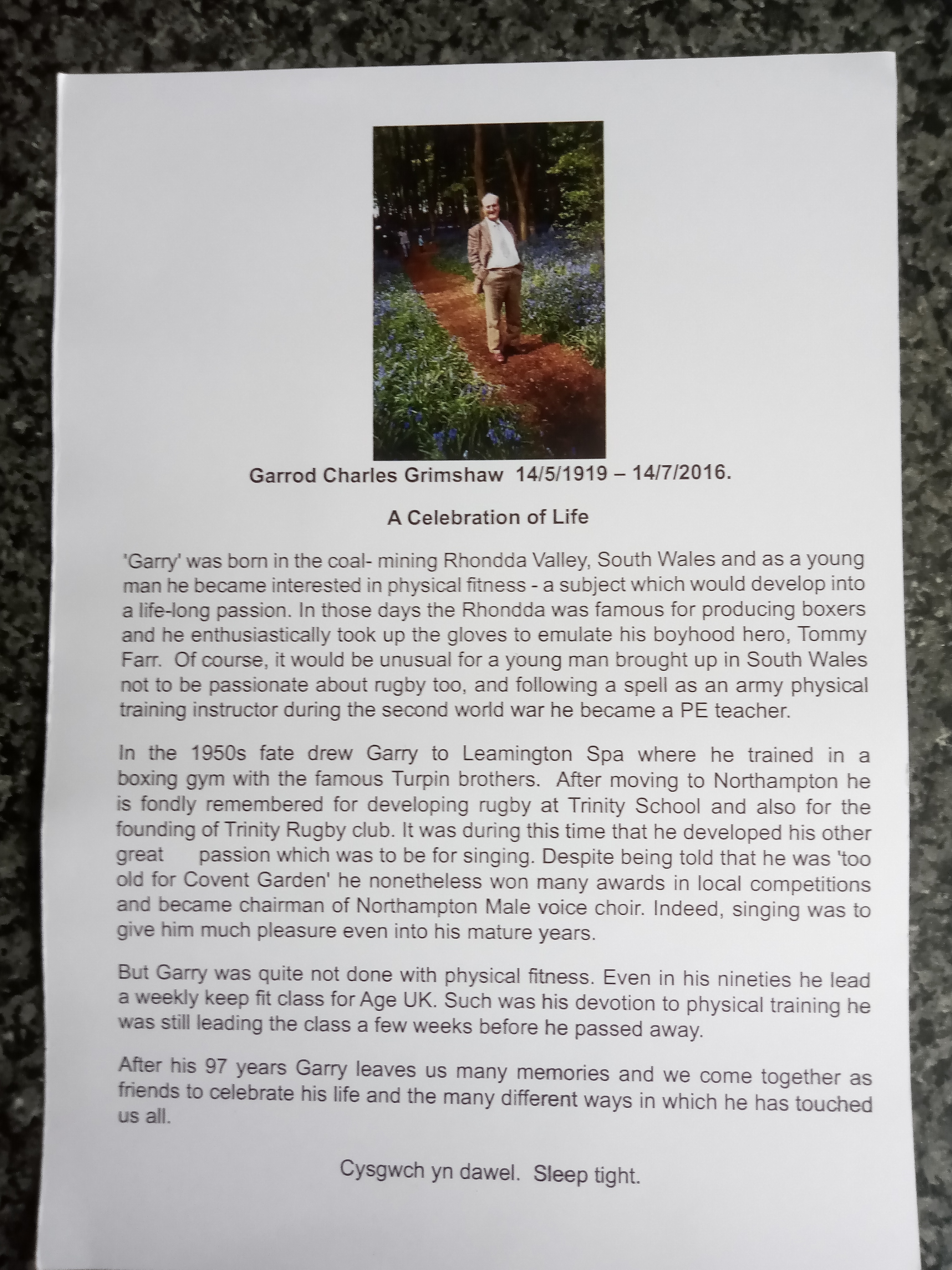 After the service he picked up a ‘Celebration of his Life’ which I have attached as a matter of great interest to the great man.